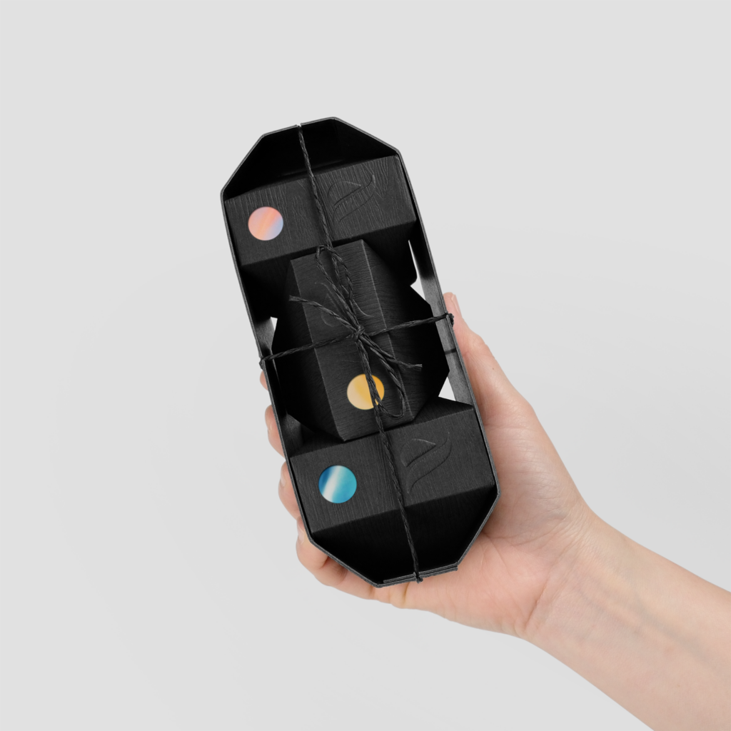 以成熟大人味的黑色進口木紋紙做包裝,忠實呈現皂體的原始風貌,讓人一抓在手上便能對這獨特的設計意圖了然於心;以紙纖繩捆紮固定,慎重如同禮品般呈現給您。