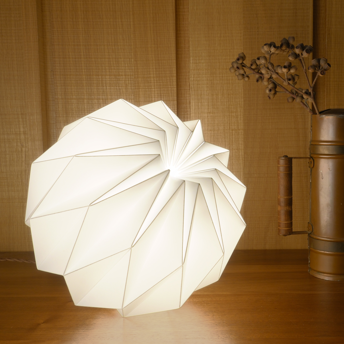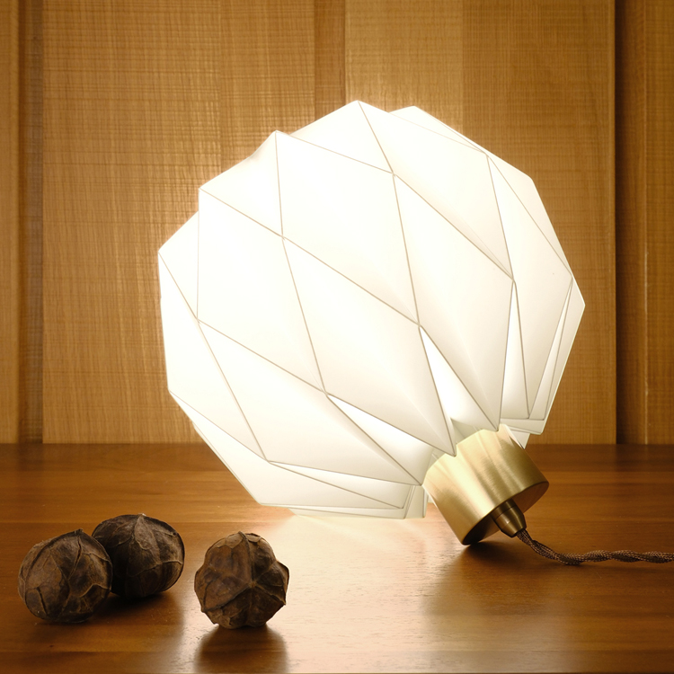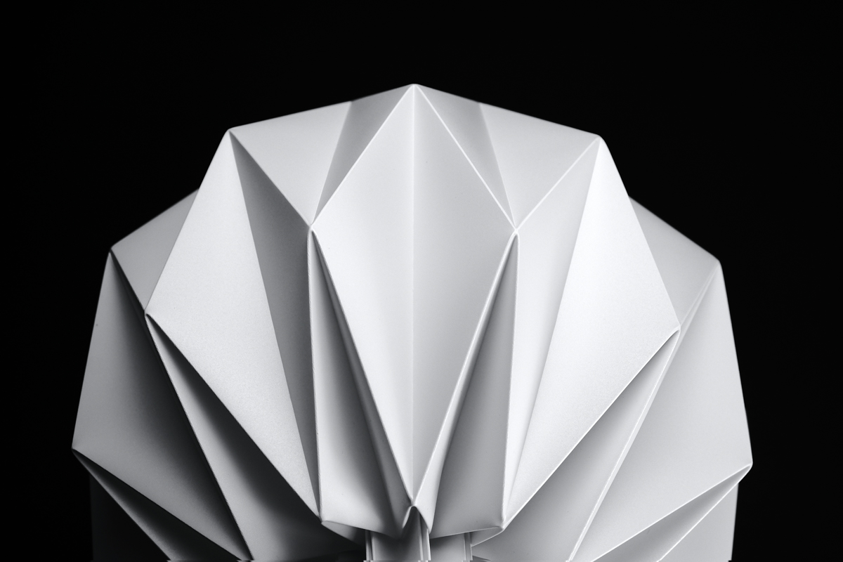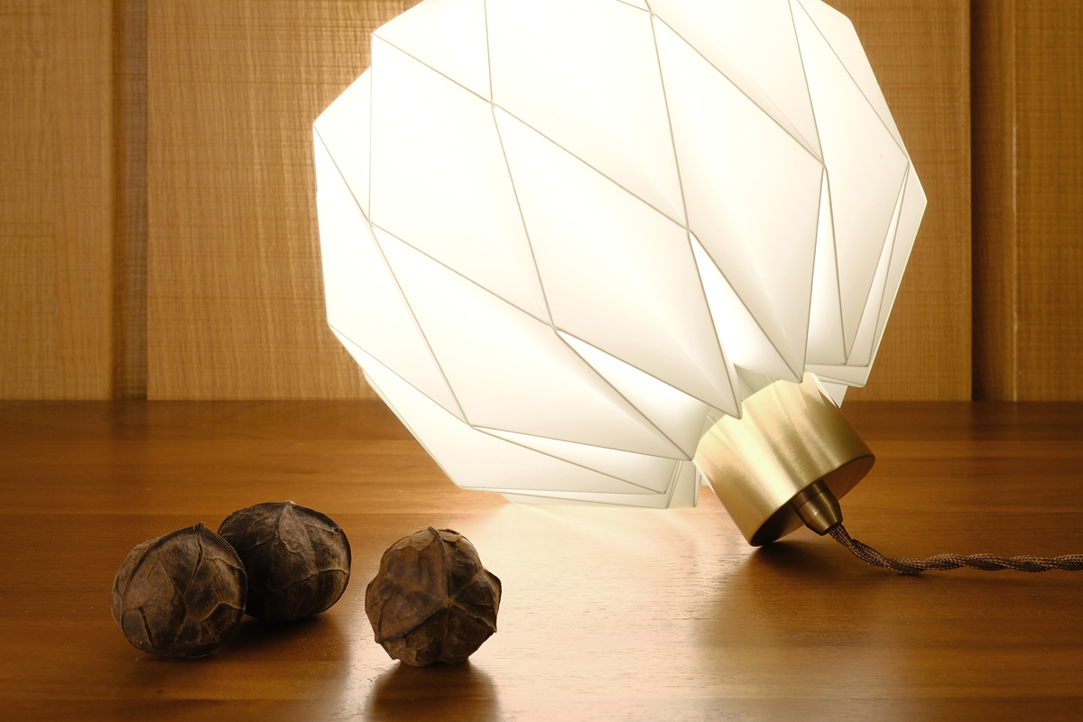 燈罩是從單一片平面的聚丙烯塑料板,以手工逐一沿著每條折線反覆凹折,方能製成一個美麗的多角面球體,其原創的摺線版型及獨特的工法呈現出與眾不同的造型美感,是無法以模具或其他機械生產方式所取代。以皮件的縫製技巧將燈罩以手穿針引線的方式做縫合,如此費工的手法就是為了讓整個球體難以看出接縫或重疊黏合的暗影,真正達到360度均勻透亮無暗影死角的極絕佳效果,除了觀賞無角度的限制也讓擺設更自由隨興。