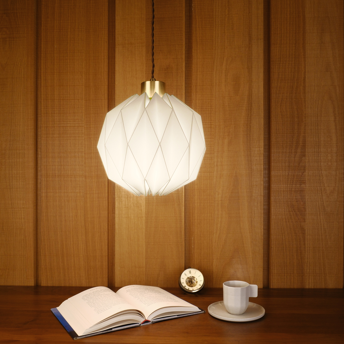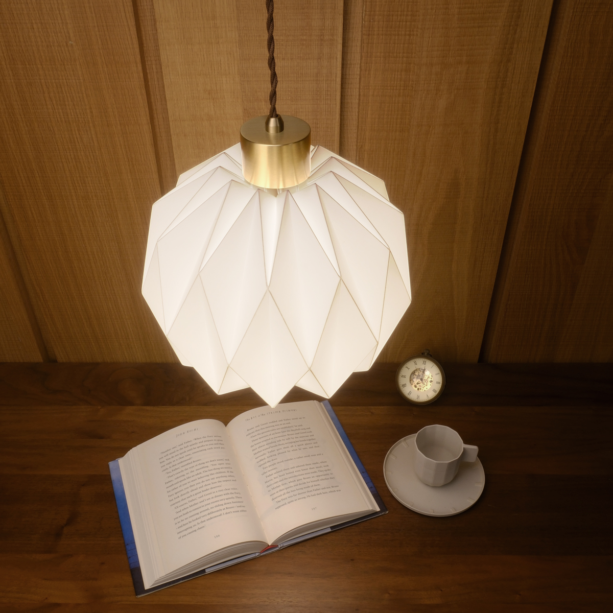 The cylindrical brass end cap is specially designed to emphasizing the origami lampshade, creating an interesting material contrast between brass & off-white plastic. The solid & heavy end cap was machined by lathes from die-cast brass part. The fine brushed hairline was manually polished by hands with an elegant shine to itself. Coated with clear paint to avoid oxidation on brass surface, therefore it always stays shining as good as new. Accompany with a nice and retro-looking dark brown braided wire at the rear end.