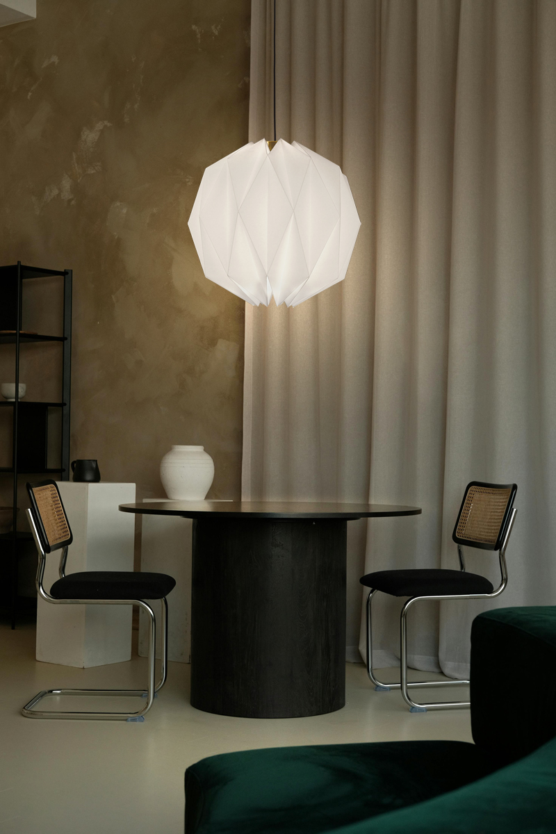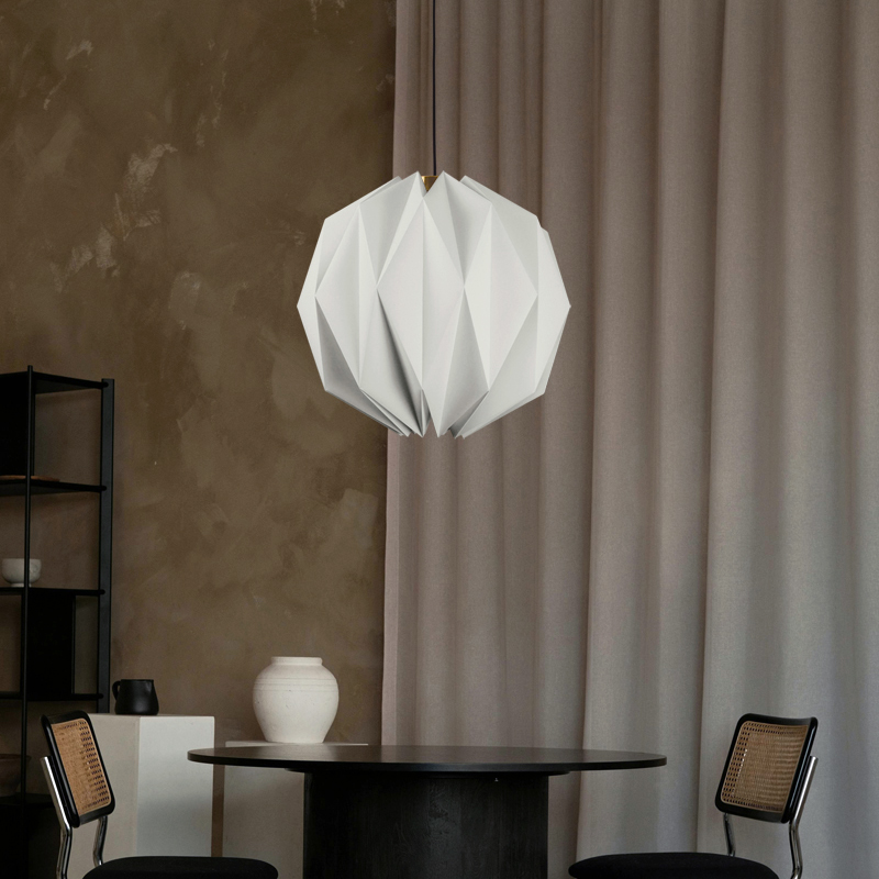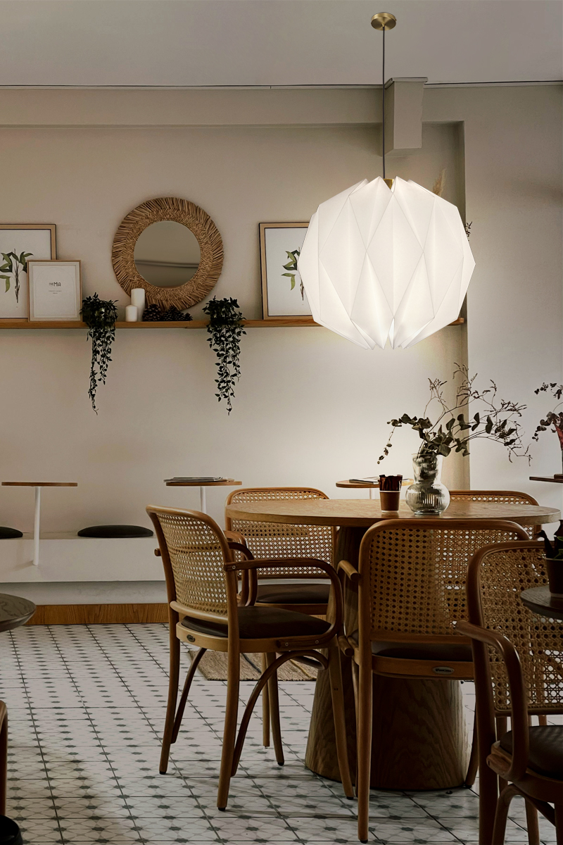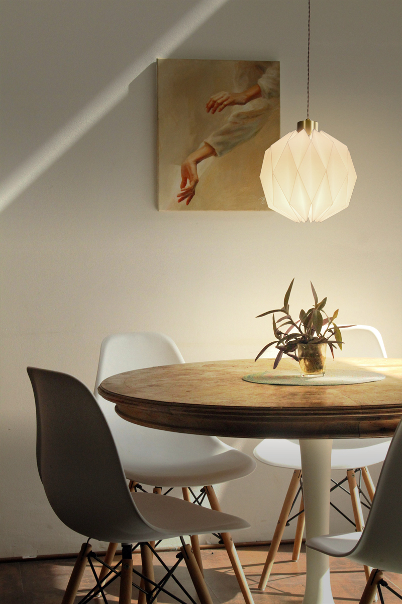 STELLAR恆星吊燈是一款不限場域性質使用的美形燈飾,可以安裝在床頭兩側、餐桌上方為您自在的棲所增色;商業空間如風格咖啡廳、甜品店、書店、餐酒館、民宿或社區公共空間都相當適合,用動人的氛圍迎接來訪的貴客。其獨特鮮明的摺紙燈罩不論是單一或多個擺設皆能成為空間當中的視覺焦點,即便燈光未開啟時也宛如一個唯美動人的風格擺飾,美麗多角面的球體能隨著光照角度帶出不一樣的光影變化;點亮後的球體燈罩稜線分明,宛如恆星般唯美動人,漫射出溫暖具有穿透力的光線將周遭渲染出柔美氛圍。