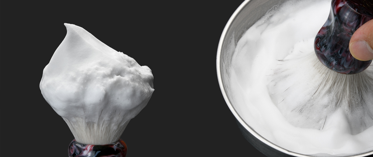 - 刷毛類型: 通常較細軟的刷毛如人造纖維的刮鬍刷,可以較快打出細緻綿密的泡沫,泡沫量也會比較多一點;較粗的刷毛如豬鬃刷則較慢達到細緻的效果,泡沫量也略少於前者。但泡沫質感及量的多寡也取決於皂/水比例及起泡方式,沒有完全絕對的關聯,可以自行嘗試比對不同上的差異。
